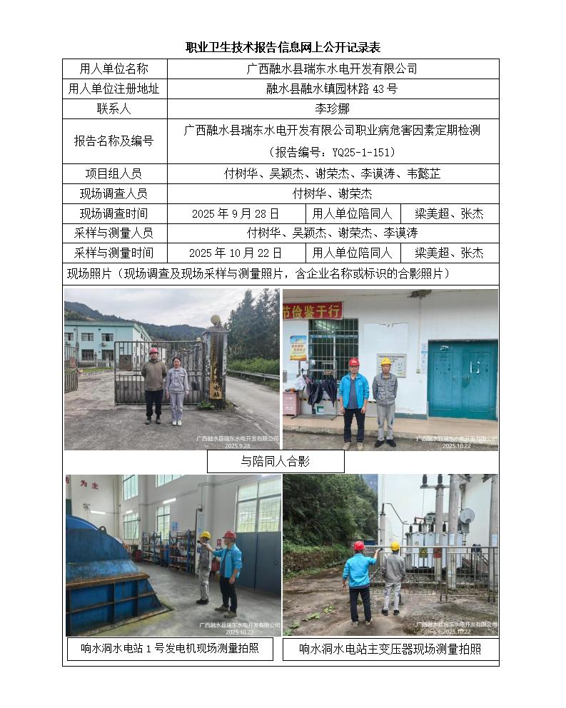 广西融水县瑞东水电开发有限公司职业病危害因素定期检测 (报告编号:YQ25-1-151)