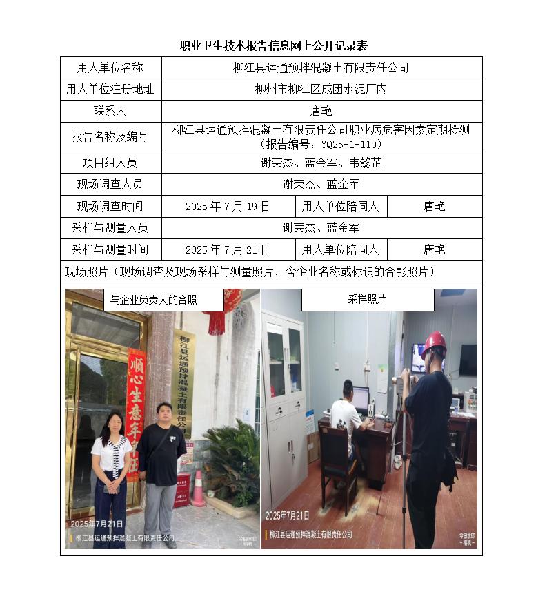 柳江县运通预拌混凝土有限责任公司职业病危害因素定期检测