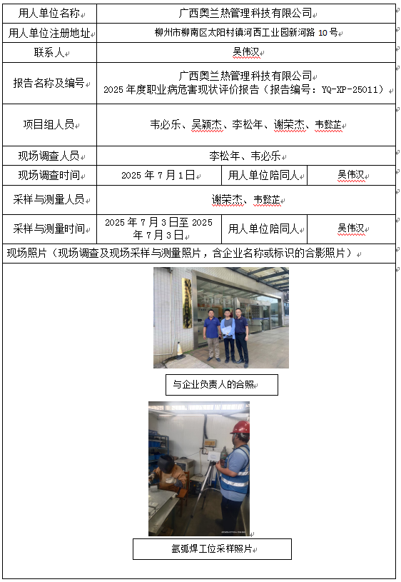 广西奥兰热管理科技有限公司 2025年度职业病危害现状评价报告