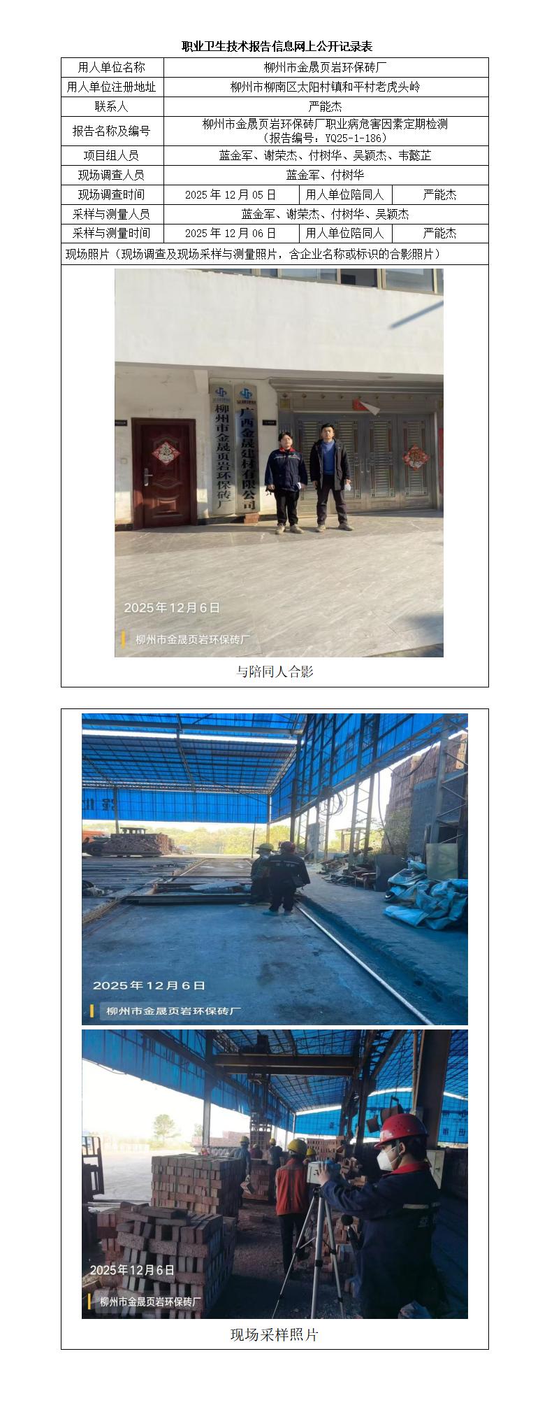 柳州市金晟页岩环保砖厂职业病危害因素定期检测 (报告编号:YQ25-1-186)