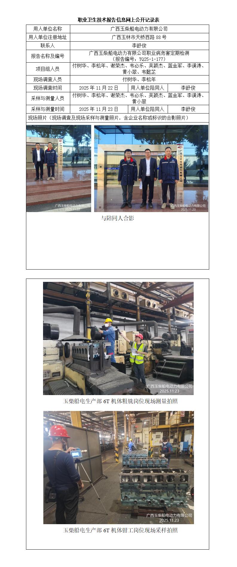 广西玉柴船电动力有限公司职业病危害定期检测 (报告编号:YQ25-1-177)
