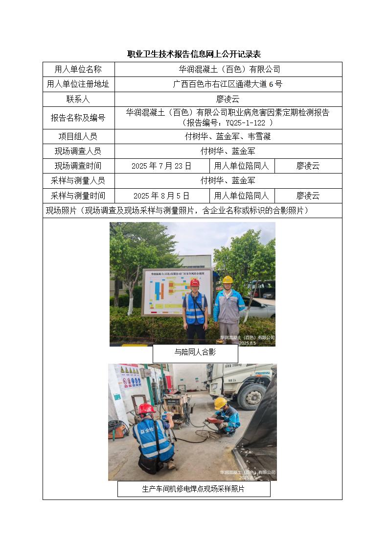 华润混凝土(百色)有限公司职业病危害因素定期检测