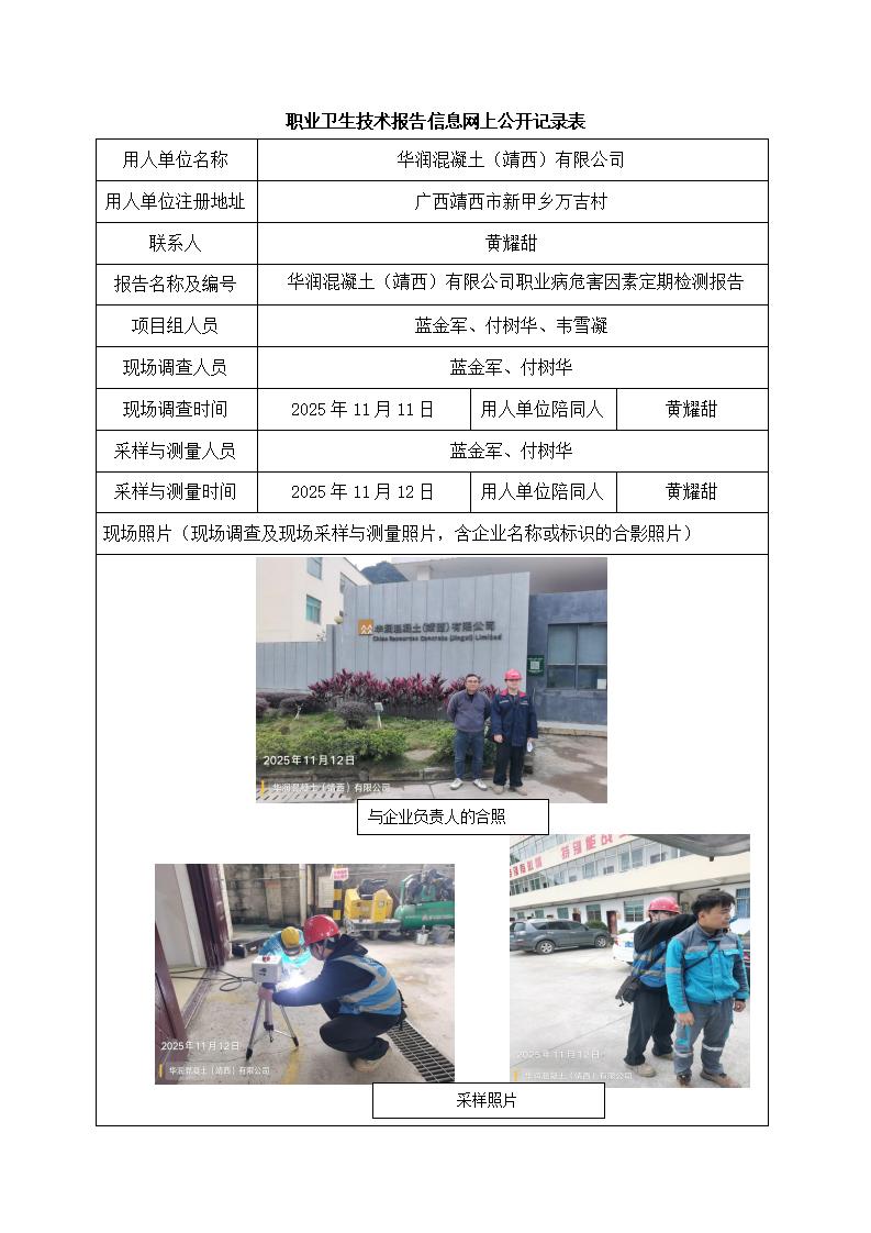 华润混凝土(靖西)有限公司职业病危害因素定期检测报告公开信息