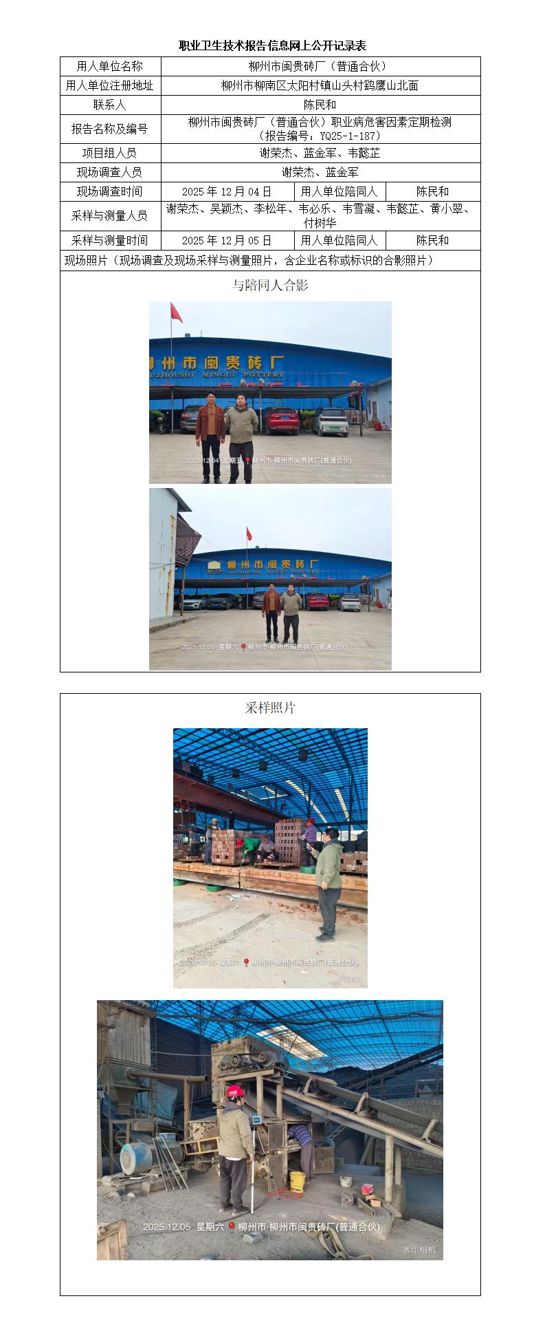 柳州市闽贵砖厂(普通合伙)职业病危害因素定期检测 (报告编号:YQ25-1-187)
