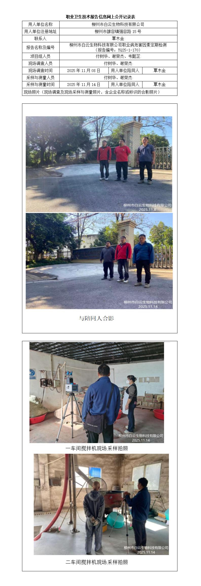 柳州市白云生物科技有限公司职业病危害因素定期检测 (报告编号:YQ25-1-170)