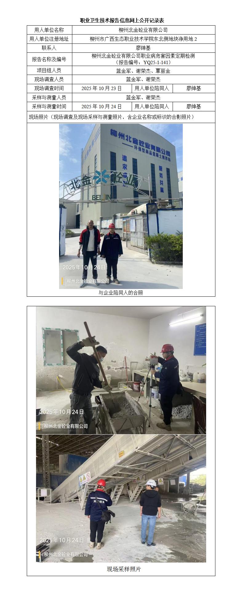 柳州北金砼业有限公司职业病危害因素定期检测