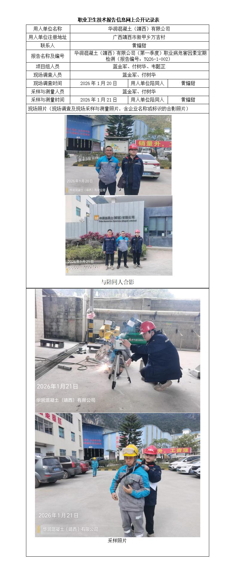 华润混凝土(靖西)有限公司(第一季度)职业病危害因素定期检测(报告编号:YQ26-1-002)