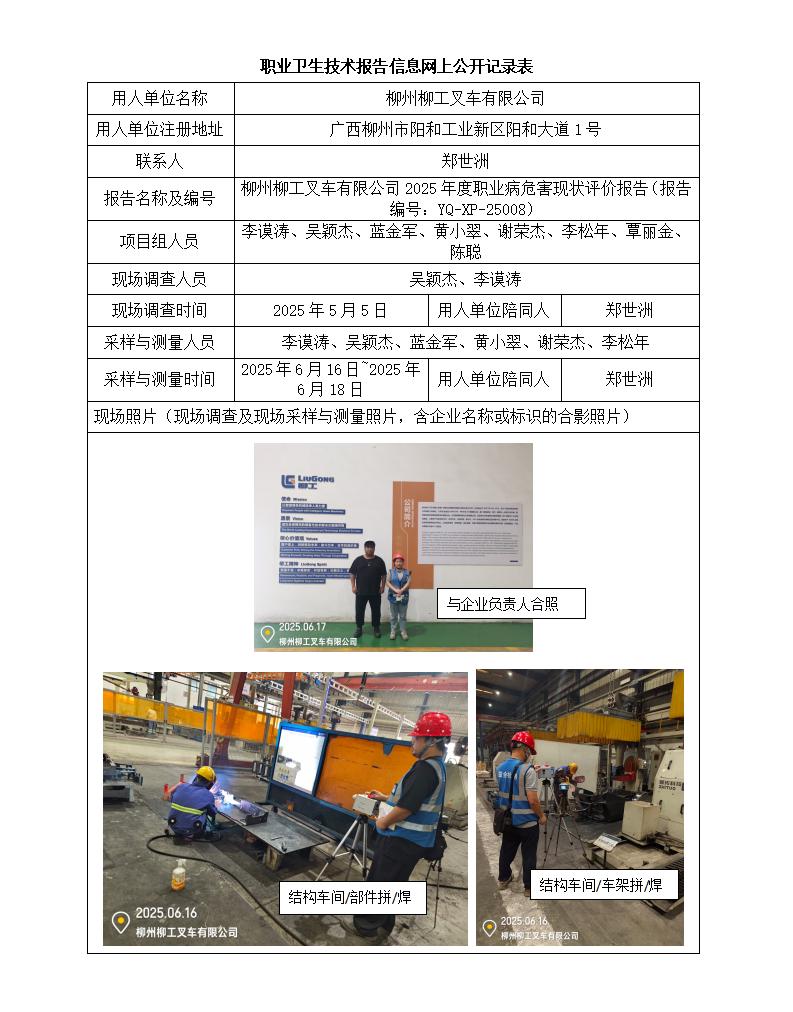 柳州柳工叉车有限公司2025年度职业病危害现状评价报告