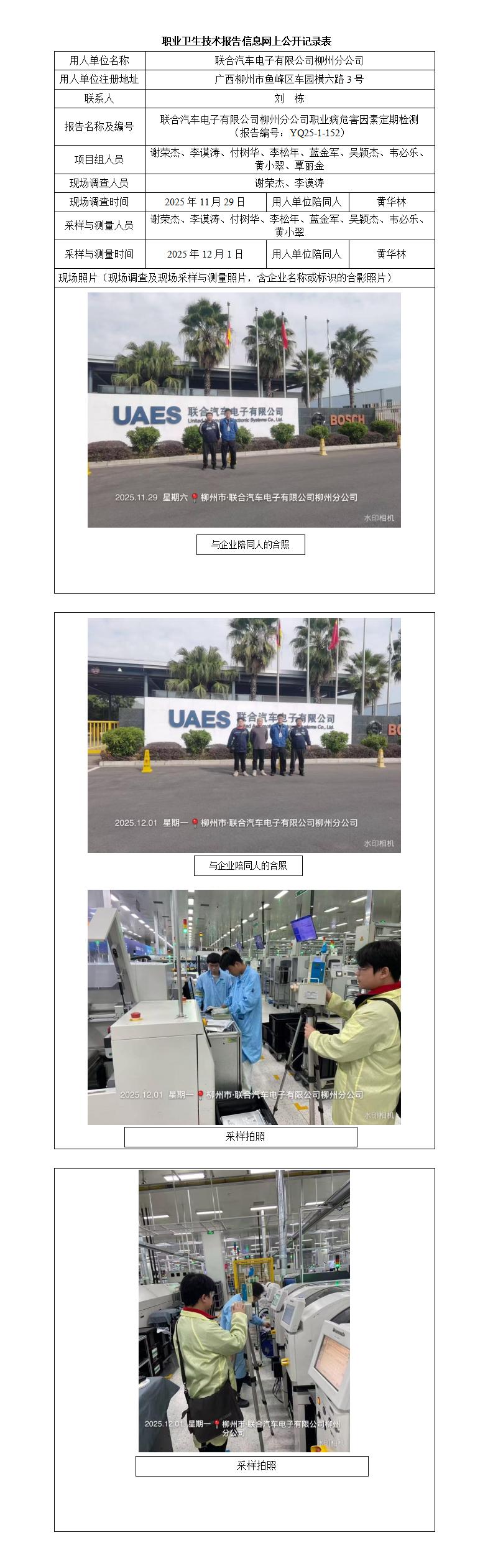 联合汽车电子有限公司柳州分公司职业病危害因素定期检测