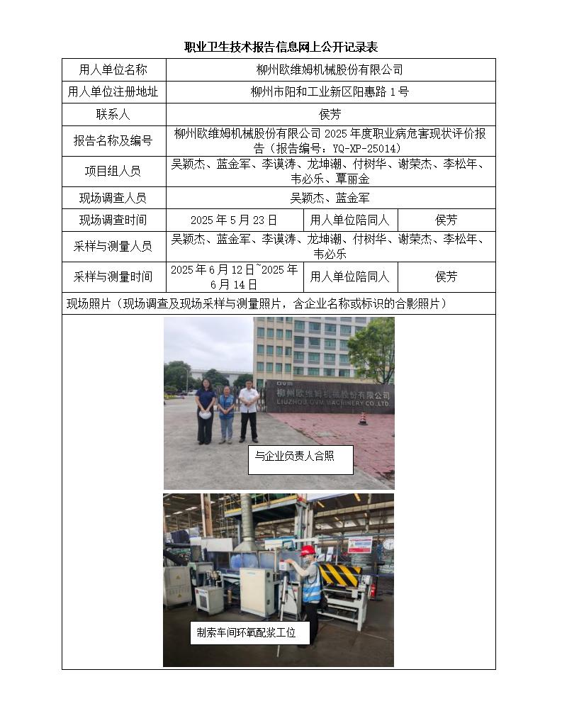 《柳州欧维姆机械股份有限公司2025年度职业病危害现状评价报告》