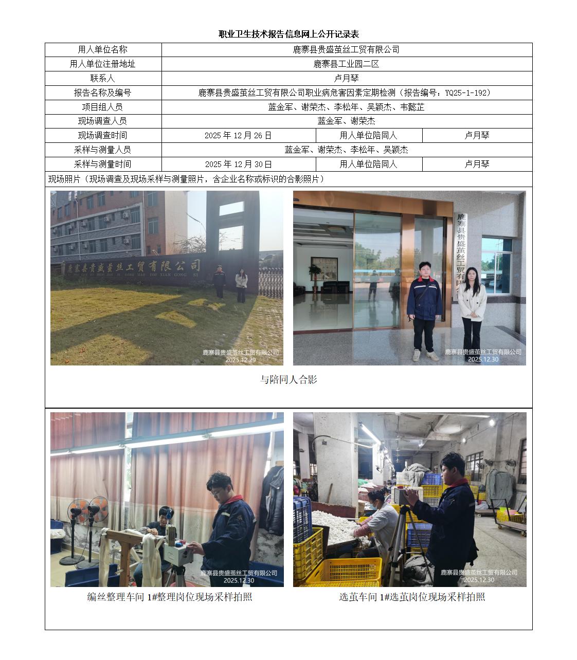 鹿寨县贵盛茧丝工贸有限公司职业病危害因素定期检测(报告编号:YQ25-1-192)