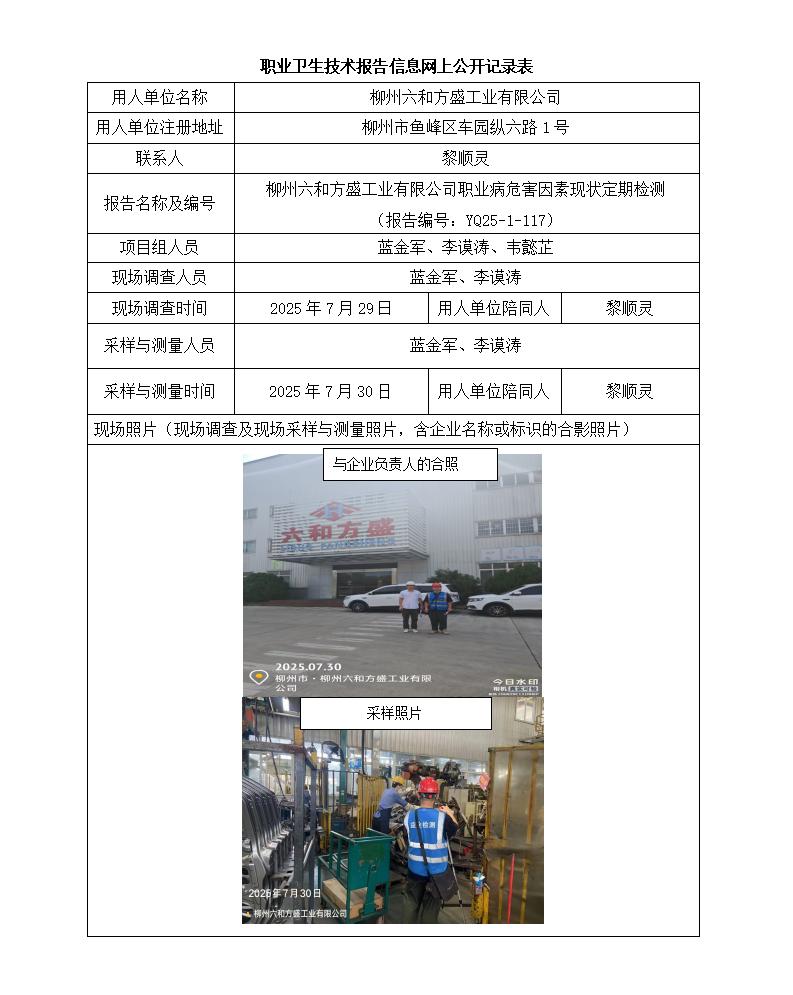 柳州六和方盛工业有限公司职业病危害因素现状定期检测 (报告编号:YQ25-1-117)